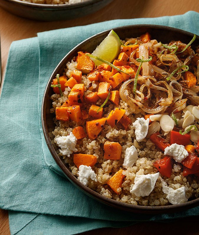 Think of a quinoa bowl as a beautiful - and delicious! - white canvas, which you can paint with colorful veggies, nuts and seeds, and pretty much any topping you want. We roasted some butternut squash, sautéed some onions, and tossed it all together with almonds and goat cheese for a fall-perfect vegetarian quinoa bowl. To take it one step further and make it vegan, sub for a cheese alternate or just remove altogether.