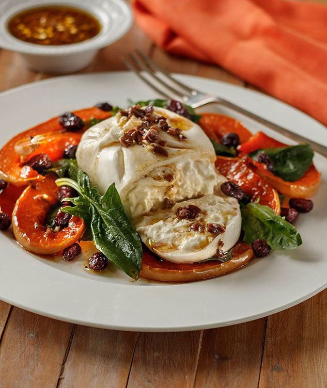 Fall comfort food can sometimes err on the site of heaviness, which is easily avoided by presenting everything in a salad format. We took the natural sweetness of squash, enhanced it with a nice roast with a drizzle of honey to caramelize it, and paired it with creamy mozzarella burrata, for a satisfyingly luscious yet light dish.