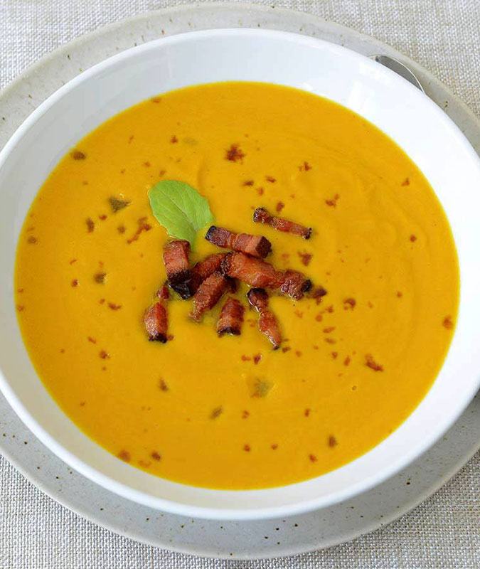 This soup could not be easier to make, and it’s comforting and hearty without being heavy. We paired it with salty prosciutto to add some nice saltiness to the naturally sweet squash.