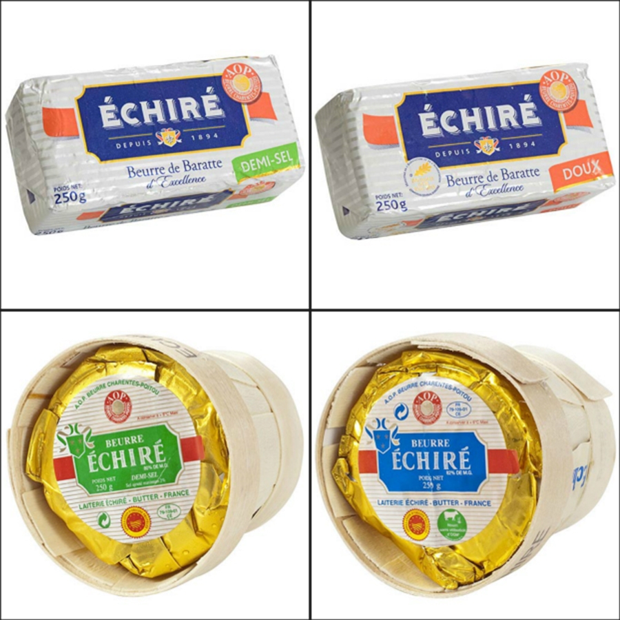 At Gourmet Food Store, we sell Échiré in either salted or unsalted varieties, each presented in bar or basket. The salted variety, "Demi-sel," is ideal for spreading on bread and croissants but can also be used in cooking recipes. Some recipes will instead call for unsalted, “Doux” butter, since the chef can more easily control the recipe’s salt levels independent of the butter. Most of our customers buy Échiré in a bar, but the basket offers a more quaint and traditional presentation, making it ideal for gifts.
