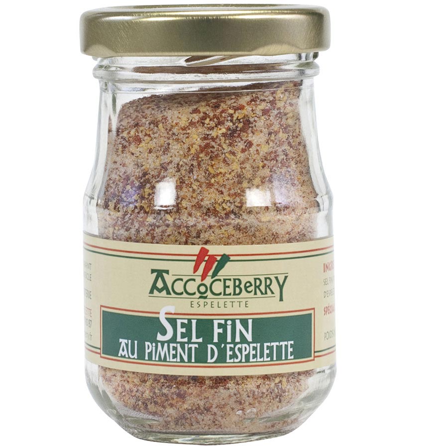 Fine Sea Salt with Espelette PepperThis revered variety of chili pepper is found in the Basque County region of France, although its origins are in Mexico. It became so popular and so deeply entrenched in Basque cooking, that Espelette Pepper was granted AOC status in 2000, thereby protecting its origin, name and production methods. It's used mainly to season meats and ham. Flavorful but not incredibly spicy, it's a key ingredient for the Piperade dish.Ingredients: fine salt, espelette pepper (10%)Availability: Usually ships within 1 business days. Product is non-perishable and can ship via Ground service. Types of Spices: Chili, Harissa, Espelette, Sea Salt & Rock SaltBrand: AccoceberryOrigin: France