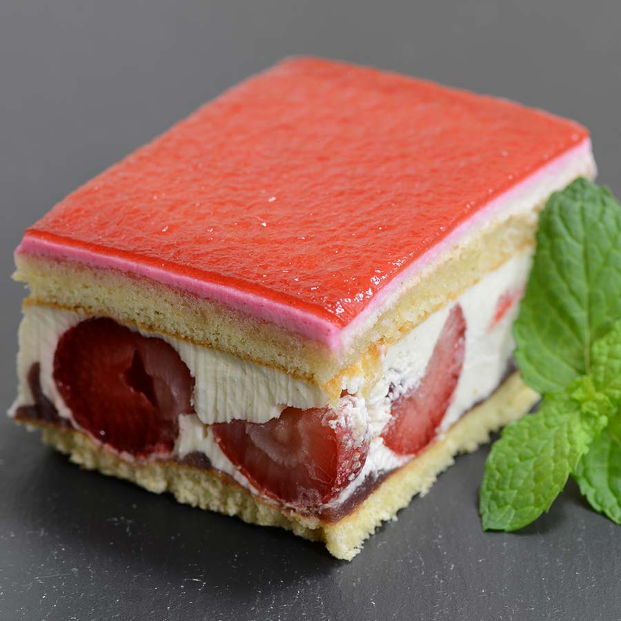 A dream crafted with a sumptuous vanilla cream and fresh, sweet strawberries, this dessert is what cake dreams are made of. Two layers of airy, perfectly moist sponge cake encase a filling that’s made with rich cream and perfect slices of ripe strawberries, topped with an elegant strawberry gellee.