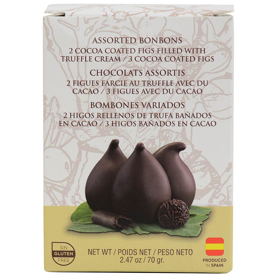 Assorted Chocolate Coated Figs, With Truffle Cream and PlainOur Assorted Fig Bonbons with Truffles are a juicy and sweet confectionery from Spain, perfect as a gift or self-indulgent treat. This assorted pack contains 2 different kinds of bon bon: Cocoa coated figs filled with truffle cream: The chocolatiers of Indeal have selected the finest Mediterranean figs, filled them with silky-smooth truffle cream and covered them with a seductive layer of cocoa. Together these 3 authentic ingredients create a scrumptious bon bon that will be you or your recipient's new addiction! Cocoa coated figs: these figs have also been coated in cocoa, but are not filled with truffle cream, letting the luscious juiciness and sweet flavor of the fig speak for itself. These gluten-free bon bons are made by Indeal. Based in Spain, this company combines extensive skill and experience with meticulous selection of the finest ingredients, creating delicious and authentic confectionery products such as fig chocolates, date bon bons and choco crisps. Buy chocolate online from Gourmet Food Store, delivered to your door with ease. Ingredients: Cocoa coated figs filled with truffle cream: dried fig, sugar, sunflower and palm oil, vegetable fat (palm kernel, palm), fat reduced cocoa powder (27%), whey milk powder, emulsifier (lecithin, sorbitan tristearate), anitoxidants (tocopherols concentrate, ascorbyl palmitate) and flavoring (natural vanilla). Cocoa coated figs: dried fig, sugar, vegetable fat (palm kernel, palm), fat reduced cocoa powder (27%), sunflower and palm oil, emulsifier (lecithin, sorbitan tristearate) and flavoring (natural vanilla)Availability: Usually ships within 1 business days. Product is perishable and must ship via Overnight service. Sweets Selection: Chocolate Covered Figs, Other Sweets & ChocolatesOrigin: Spain