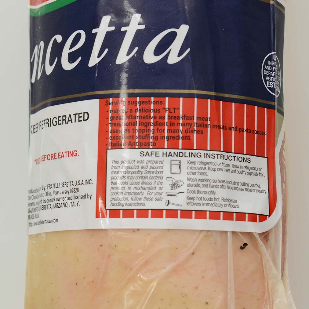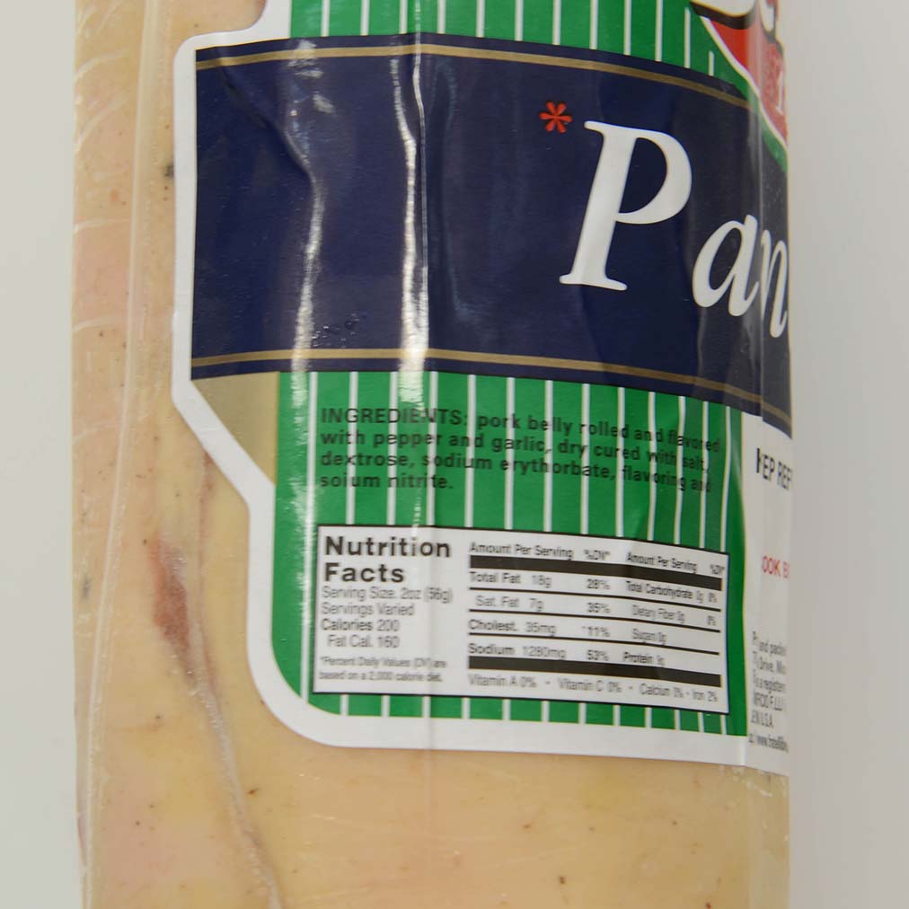 Pancetta - Rolled, UncuredIngredients: Pork belly rolled and flavored with pepper and garlic, dry cured with salt, dextrose, sodium erythorbate, flavoring and sodium nitrite.Availability: Usually ships within 1 business days. Product is perishable and must ship via Overnight service. Smoked/Cured Meats: PancettaOrigin: United States