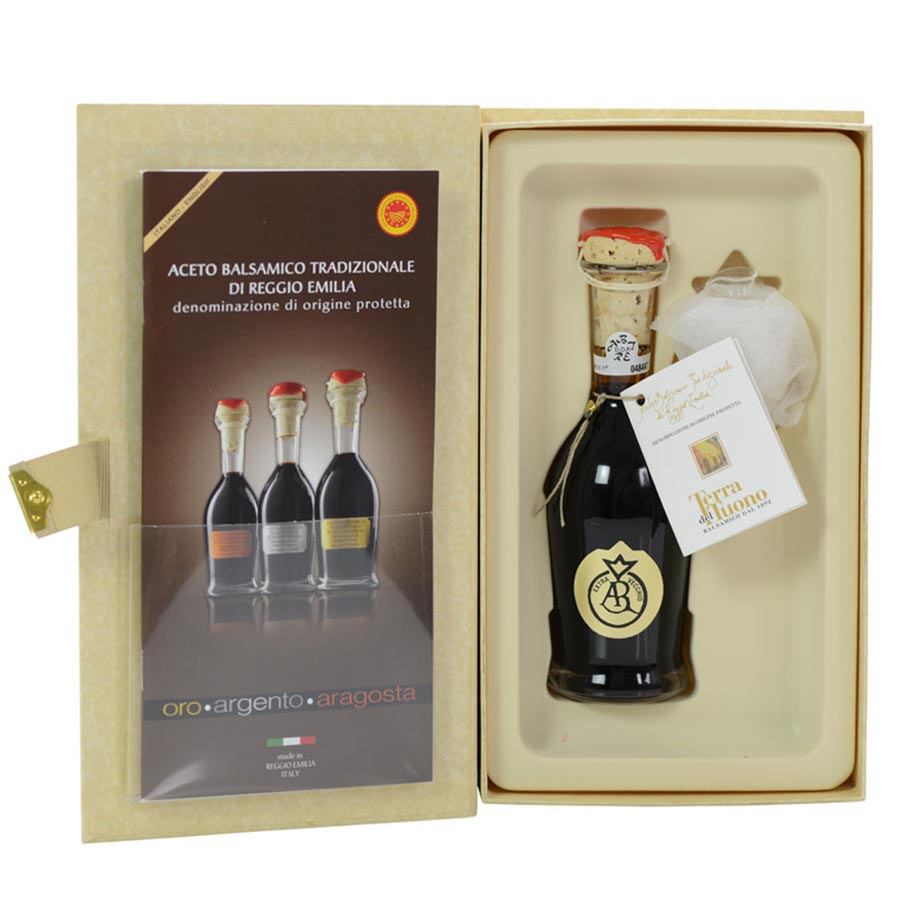 Balsamic Vinegar Of Reggio Emilia Gold SealThe traditional shape of the bottle is a mark of authenticity and guarantee of quality, making this one of the highest-quality Balsamic Vinegars ever produced. This tradizionale-style Aceto Balsamico is rich and highly aromatic, sweeter in flavor and finish than other traditional balsamic vinegarsIngredients: Slow cooked must and acidified must from Italian Grapes, aged for over 25 years in aromatic wood barrels made of oak, chestnut, cherry, mulberry and juniper. A 100% all natural premium product. No food colourings, no thickening agents, no caramels, and no preservatives are added.Storage: at room temperatureAvailability: Usually ships within 1 business days. Product is non-perishable and can ship via Ground service. Type: AgedOrigin: Reggio Emilia, Italian