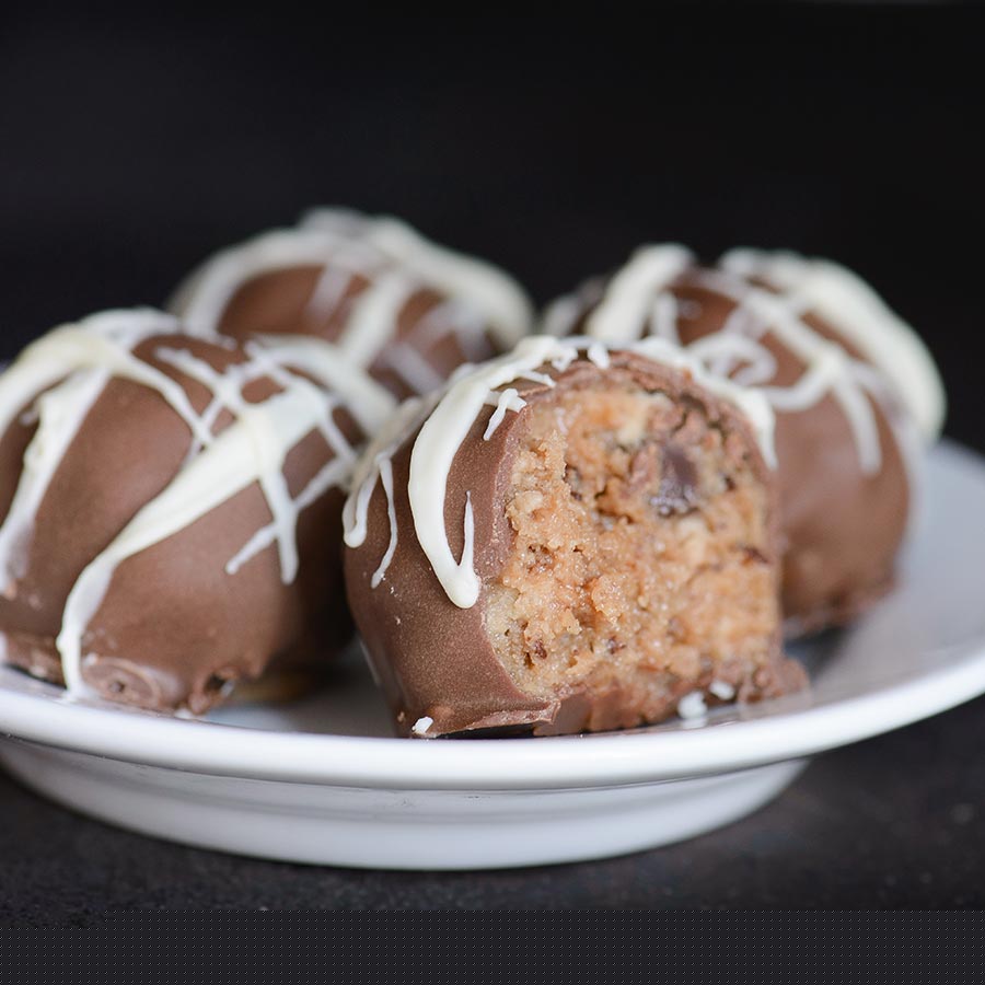 Chocolate Chip Cookie Truffles RecipeIngredients¼ cup butter, softened2 ¼ cups chocolate chip cookies, chopped7 oz. sweetened condensed milk3 1/2 oz. white baking chocolate, melted1 lb. bittersweet baking chocolate 70 %, melted and at room temperature7 to 10 oz. white chocolate, melted for decoratingDirectionsIn a large bowl cream butter with a silicone spatula or wooden spoon, then gradually mix in the chopped cookies.Add the condensed milk and the melted chocolate, mixing well.Shape into ¾ inch balls and place on waxed paper; keep in the fridge for 2 hours.The dough may be sticky, put a little powdered sugar in your hands - this will make it easier to shape the truffles.Dip the cookie balls with a fork into the melted dark chocolate coating to cover, then place on waxed paper and until set.Put the melted white chocolate in a piping bag , cut a little piece of the piping bag and make stripes on top of the truffles. Store in a fresh place until needed.This recipe is found in:Recipes by Ingredient: Chocolate RecipesRecipes by Course or Meal: Baking, Chocolate Truffle Recipes, DessertRecipes by Occasion: Labor Day and 4th of July Recipes, Holiday Recipes, Valentine's Day RecipesRecipes by Cuisine: American Recipes Recipes by Season: Fall Recipes, Winter Recipes