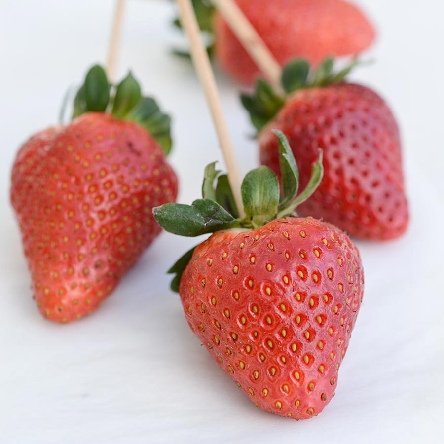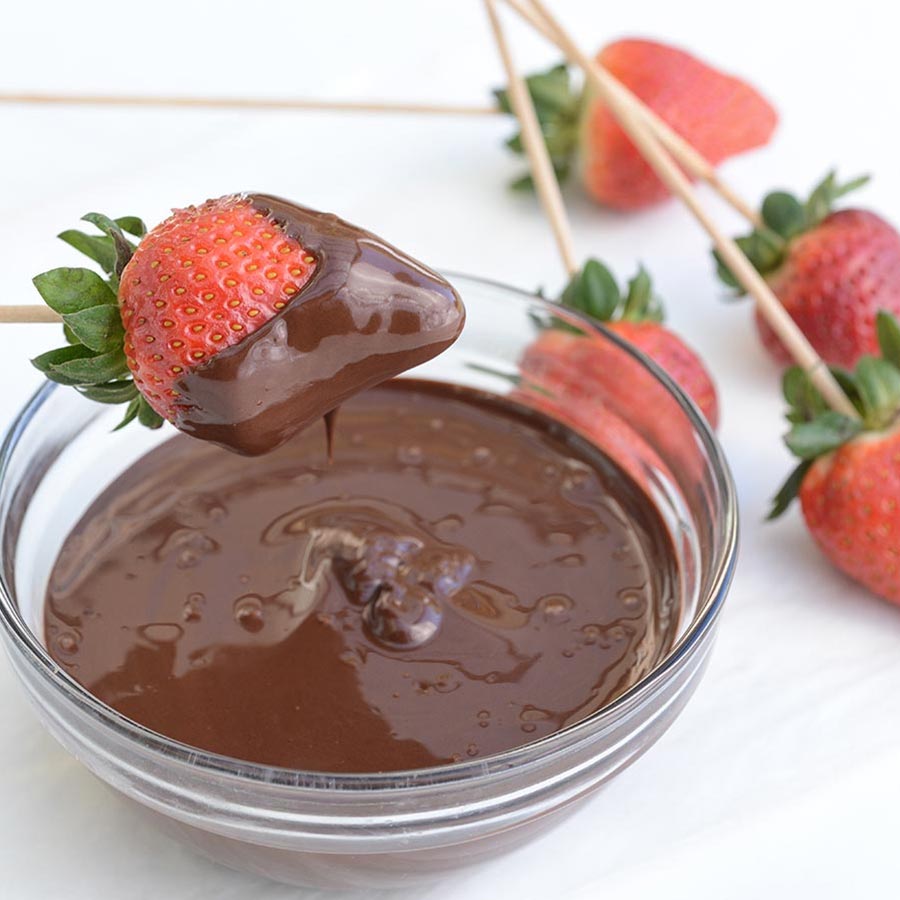 Chocolate Dipped Strawberries RecipeIngredients1.75 lbs. Bittersweet couverture chocolate, 70%18 strawberries with leaves18 bamboo skewersDirectionsMelt or temper the chocolate (which will give you a great glossy finish)Skewer the strawberries through the leafy end, making sure you have a good grip on it. Dip it in the chocolate about halfway through (or three-quarters). Let the excess drip off, without shaking. Place in parchment paper and wait till the chocolate sets and hardens, then remove the skewer (or present them with the skewer, if you chose).Keep in a cool, dark place until serving, but don’t store in the fridge, which will make the chocolate lose it’s temper. This recipe is found in:Recipes by Ingredient: Chocolate RecipesRecipes by Course or Meal: DessertRecipes by Occasion: Valentine's Day Recipes