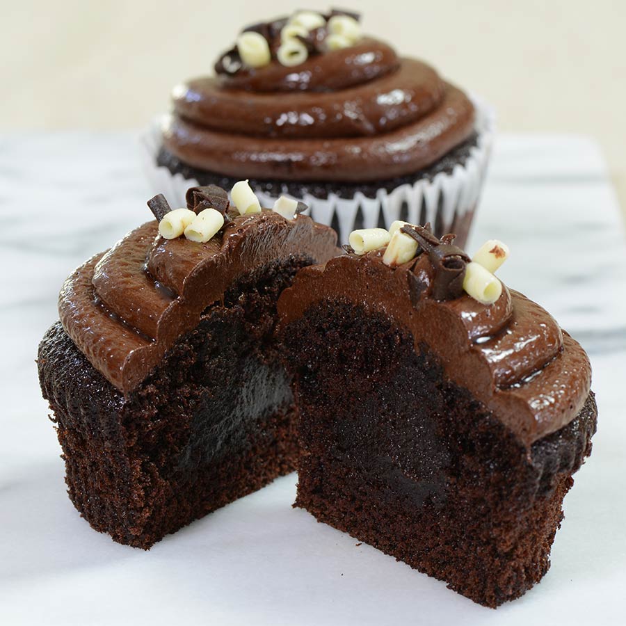 This is the cupcake for the serious chocoholic: a giant chocolate cupcake filled luscious chocolate pudding, then topped with ultra rich and decadent chocolate fudge.
