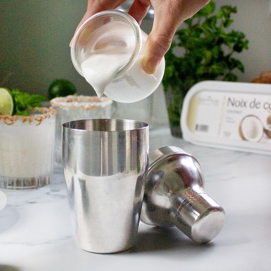 1. Add tequila, elderflower liqueur, lime juice, and coconut puree to a cocktail shaker half-filled with ice.