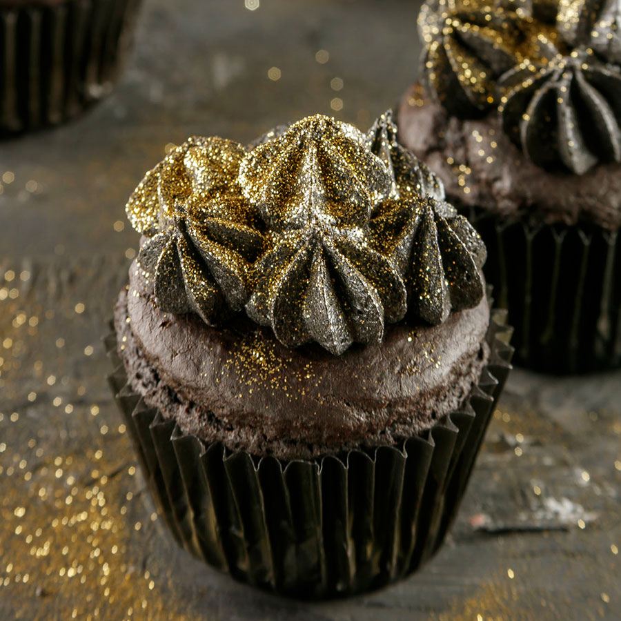 Dark Chocolate Halloween Cupcakes With Gold Dust RecipeIngredients for cupcake batter¾ cup white all purpose flour2 tbsp dark cocoa powder2 tsp baking powder¼ tsp salt3 tbsp brown sugar½ cup milk1 large egg¼ cup butter melted and at room temperature¼ cup dark chocolate melted and at room temperatureIngredients for dark chocolate cream cheese frosting ¾ cup soft cream cheese1/3 cup butter at room temperature2 cups icing sugar2 tbsp. cacao powder1 tsp. black food coloring2 tsp. edible gold dust or sheetsDirections for dark chocolate cupcake batterPreheat the oven at 400°F.Mix the flour, cacao powder, baking powder and salt in a bowl and reserve.In big bowl or stand mixer whisk the eggs, brown sugar, milk, butter and chocolate.Add the flour mixture to the bowl with the liquid ingredients and mix briefly with a large wooden spatula until the flour mix is moist and the mixture lumpy (that makes the cupcakes light).Place the batter in silicone cupcake molds or paper wrappers, and fill until 2/3 full.Bake 10 to 12 minutes until done. Cool for 5-10 minutes on a cooling rack.Directions for dark chocolate cream cheese frostingSift the icing sugar and cacao powder and divide in three parts.Using a rubber spatula, beat the cream cheese in a bowl until smooth.Incorporate the butter and the icing sugar/cacao mix a little at a time, in batches. Mixing each batch until fully incorporated and free of lumps before adding the next one, then finally add the food coloring.Keep the mix in the fridge in an airtight container. When cold, place in a piping bag with a round nozzle (or your favorite!) and decorate the cupcake, finishing with a sprinkle of gold dust or little pieces of edible gold sheet.This recipe is found in:Recipes by Ingredient: Chocolate RecipesRecipes by Course or Meal: Baking, DessertRecipes by Occasion: Halloween Recipes, Holiday RecipesRecipes by Cuisine: American Recipes