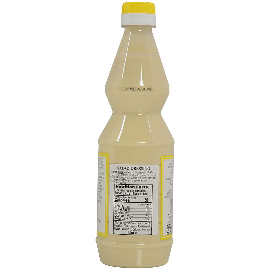 Ingredients: Water, sunflower oil (37.5%), Dijon mustard (mustard seeds, alcohol vinegar, water, salt), egg yolk, white wine vinegar, salt, thickener: xanthan gum, spices, extract.
