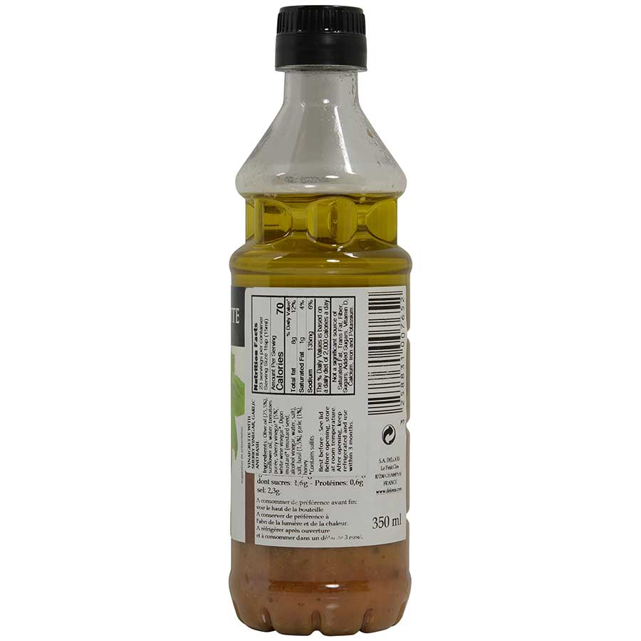Ingredients: Olive oil (25.5%), sunflower oil, water, tomatoes puree, sherry vinegar (5%), white wine vinegar, Dijon mustard (mustard seeds, alcohol vinegar, water, salt), salt, basil (1.5%), garlic (1%), honey.