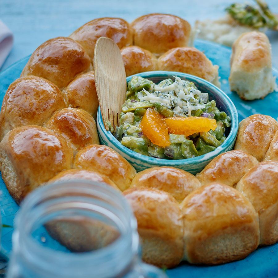 Easter Bread Wreath with Gorgonzola Avocado Dip RecipeIngredients 1 lb. all-purpose flour2 tsp. salt½ tbsp. sugar2 ½ tsp. dry yeast200 ml. lukewarm water100 ml. milk, room temperature2 tbsp. butter, melted1 tbsp. olive oil1 egg yolk mixed with ½ tbsp water4 avocados peeled and cut in small cubes1 orange cut in wedges without skins2 finely chopped scallions2 tbsp. olive oil¾ cup skim cream½ cup grated Gorgonzola blue cheeseDirectionsPut 1 lb. of flour in a large bowl and add the yeast. Make an indent or hole in the center and slowly add the water, milk, butter and olive oil. Mix with a wooden spatula or spoon until well incorporated, adding more flour as needed.Transfer the dough to a working surface and knead until firm and elastic – not sticky. Place in a bowl and cover with a damp cloth. Reserve in a warm place to rise until the dough doubles in size. Knead once or twice, and divide the dough in 13, 1-oz. balls and 9, ¾ oz. balls.Brush a cake pan with olive oil, and place 3-inch cookie cutter in the center. Arrange the dough balls one by one around the cookie cutter – there should be room between each to allow them to double in volume.Cover with a cloth and leave it to rise in a warm place until the dough balls double in volume and touch each other. Brush with the yolk-and-water mix and bake for 10 minutes at 375. Lower heat to 350 F and continue cooking until golden, about 20/25 minutes.Unmold into a platter without the cookie cutter. Let it cool and serve with the dip.For the dip, mix the avocados with the orange wedges and any orange juice drippings, add the scallions, olive oil, and cream, gorgonzola cheese and mix well. Garnish with parsley and chives and serve in the middle of the “wreath”.This recipe is found in:Recipes by Course or Meal: Appetizers and Side Dishes, BakingRecipes by Occasion: Easter Recipes, Thanksgiving Recipes, Holiday Recipes, Valentine's Day Recipes, Super Bowl RecipesRecipes by Cuisine: American Recipes Recipes by Season: Spring and Summer Recipes, Fall Recipes