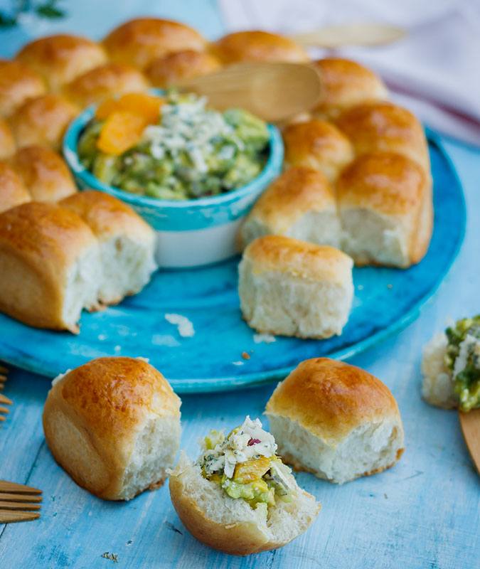 Forget the bread basket, the bread wreath is what you always wanted and just didn’t know you needed it! And it couldn’t be easier to make: a few artfully arranged bread dough balls and you’ve got a centerpiece dish that will wow your guests. We served ours with an indulgent dip made with rich gorgonzola cheese and creamy avocado, but you can pick your favorite dip, or just blend some Greek yogurt and dill or parsley with a squeeze of lemon for a fresh option.