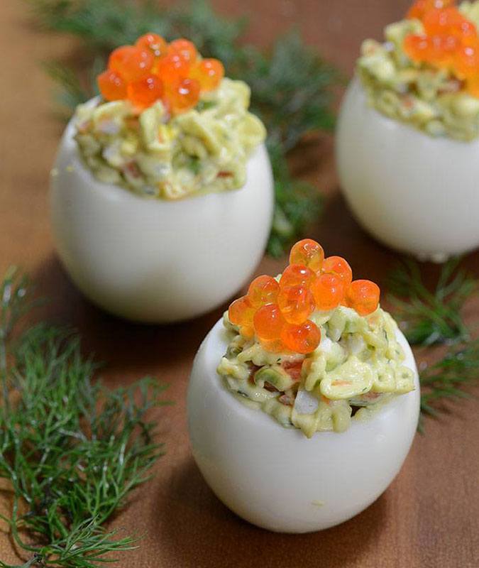 We love this fresh this take on deviled eggs, and it’s sophisticated to boot! Egg yolks are minded with avocado, smoked salmon, dill, lime and mayo, for a bright flavor that tastes just luxurious. The trick for that elegant look? A simple piping bag with a star tip. Top it all off with salmon roe caviar.