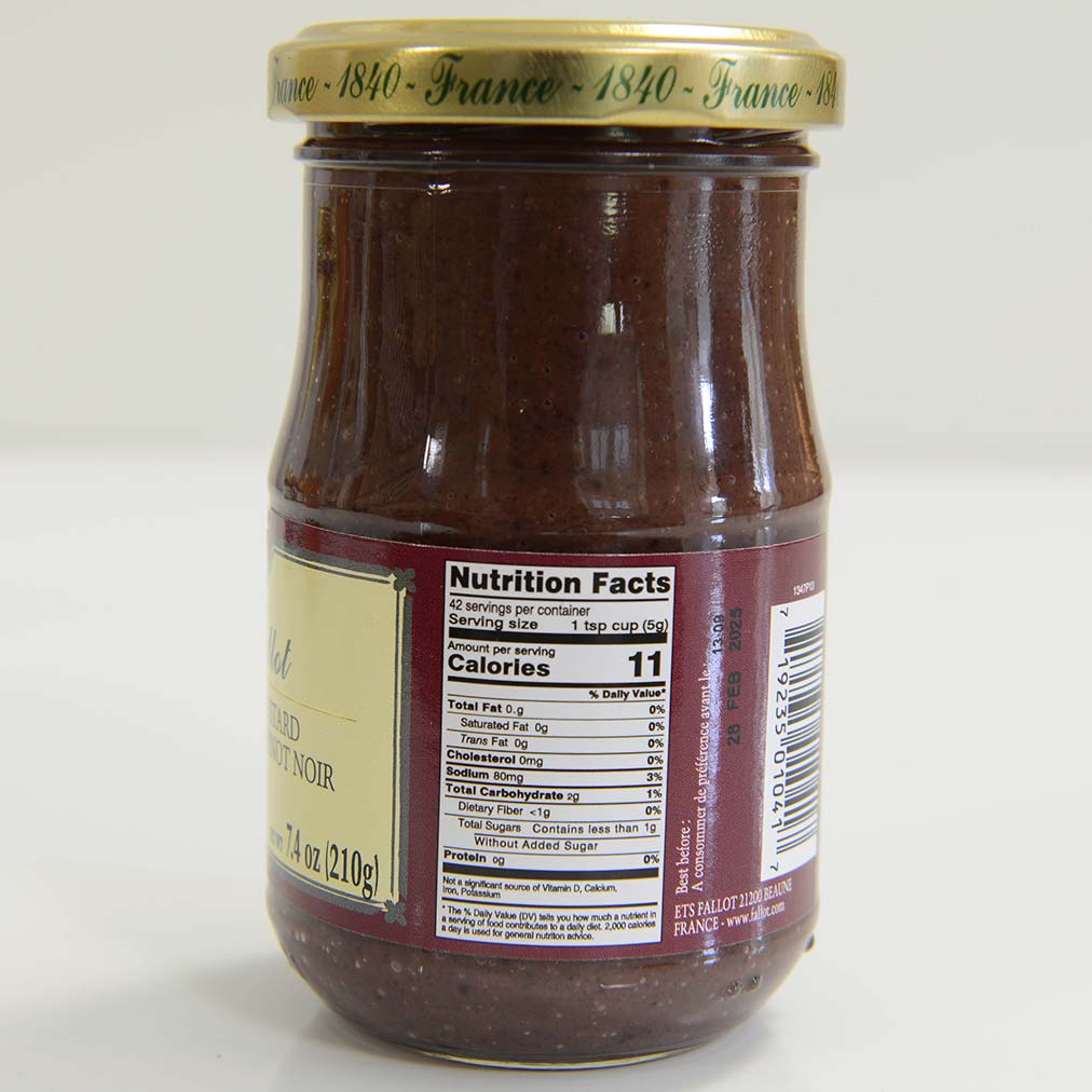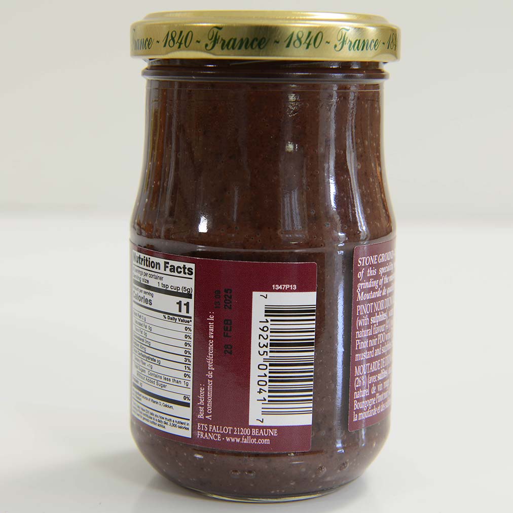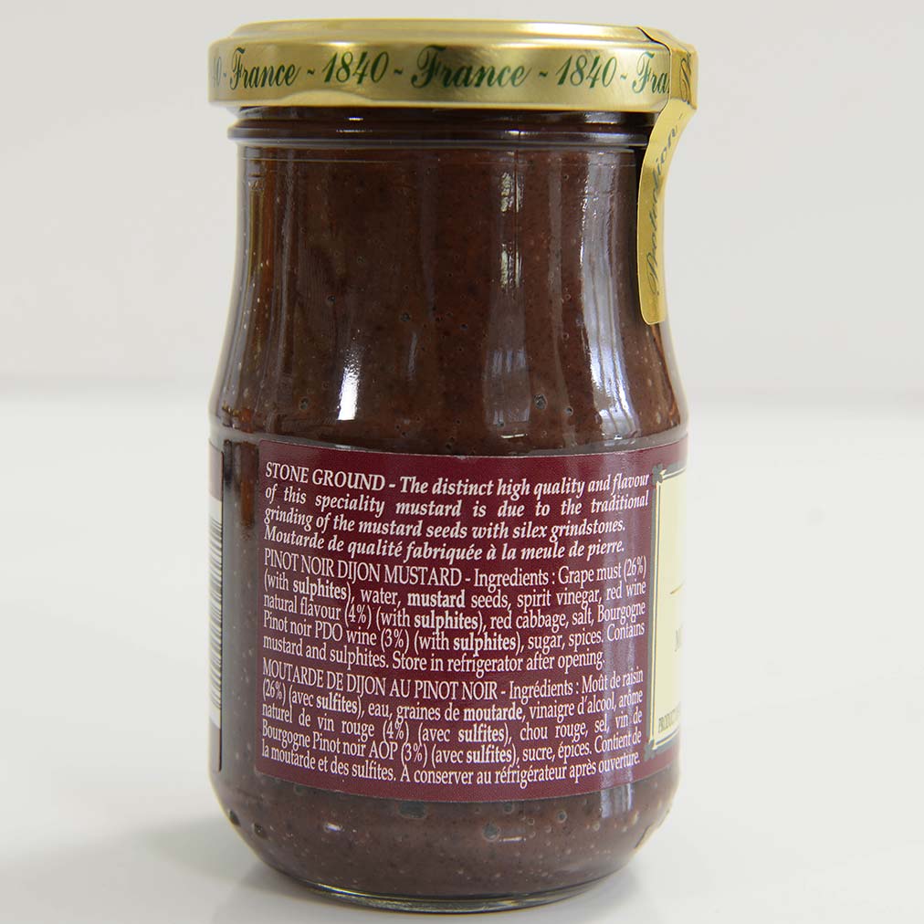 Mustard with Pinot NoirIngredients: Grape must (26%) (with sulfites), water, mustard seeds, vinegar, red cabbage, natural aroma of red wine (4%) (with sulfites), salt, Pinot noir PDO wine (3%) (with sulfites), sugar, spices.Availability: Usually ships within 1 business days. Product is non-perishable and can ship via Ground service.