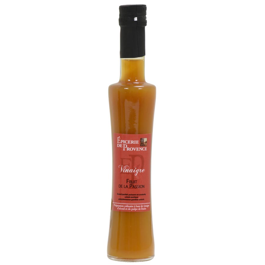 Passion fruit VinegarAn easy and delicious way to add a splash of exotic fruit flavor to salads, desserts and sauces. Epicerie De Provence's Passion Fruit Vinegar is made with at least 40% passion fruit pulp, blended with alcohol vinegar, giving this an intense flavor and a great balance of sweet, fruity notes with the tartness of the vinegar. Deglaze meats and fish, caramelize vegetables, create incredible vinaigrettes and more.Ingredients: alcohol vinegar 8 grades, 41% passion fruit pulp, cristal sugar, thickening agent: apple pectinAvailability: Usually ships within 1 business days. Product is non-perishable and can ship via Ground service. Types of Vinegar: Fruit Based VinegarOrigin: French
