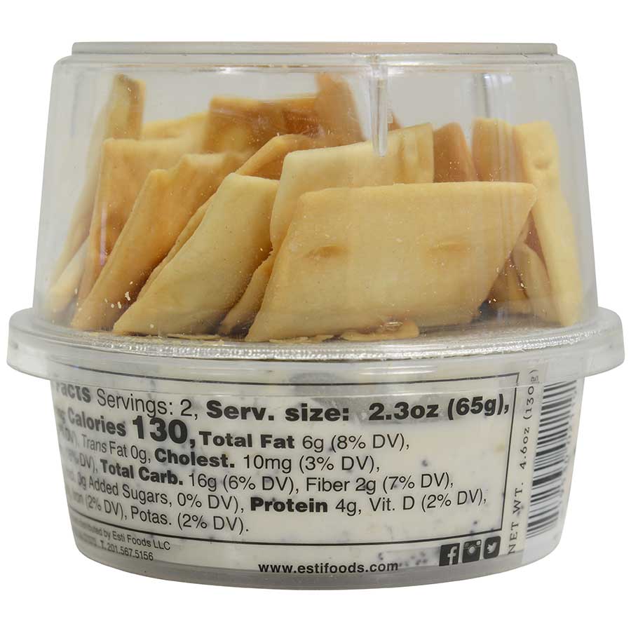 To complete your snacking experience, Esti’s includes crunchy golden pita chips, the perfect partner for this creamy, savory dip. The ideal snack, take this dip on the go for a quick pick me up on a busy day, pack into your picnics, and keep a few on hand for last minute guests and unexpected visitors.