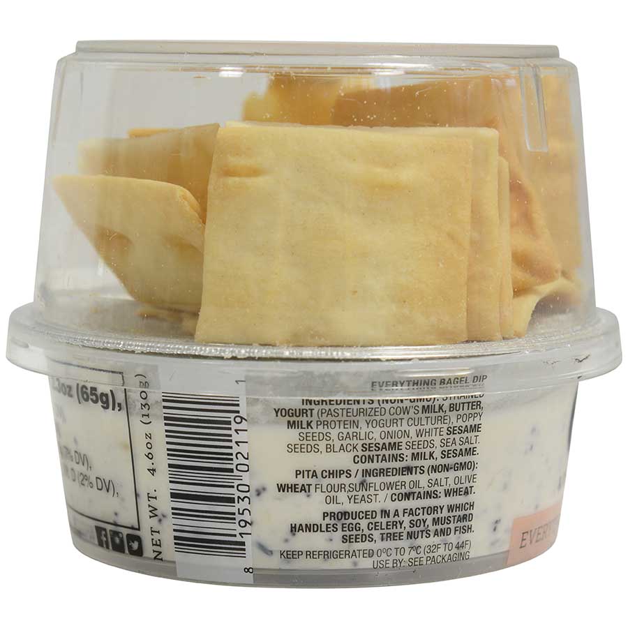 Ingredients: Everything Bagel Dip: Strained yogurt (pasteurized cow's milk, butter, milk protein, yogurt culture), poppy seeds, garlic, onion, white sesame seeds, black sesame seeds, sea salt.