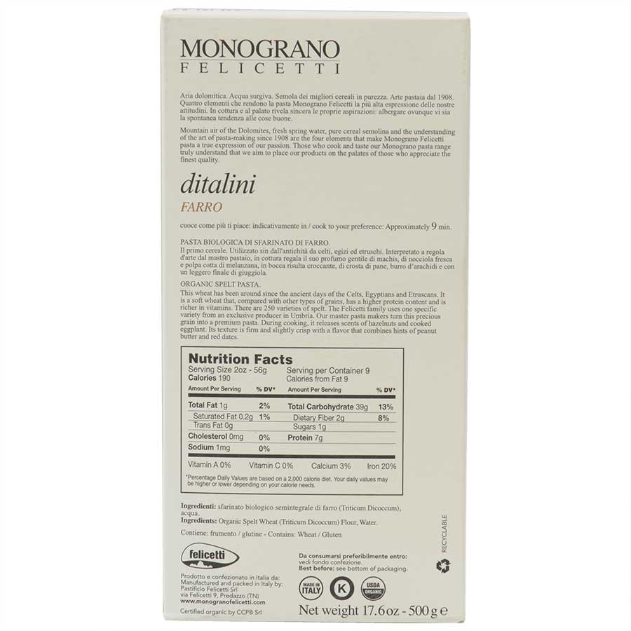 This organic Ditalini farro pasta offers a uniquely delicious eating experience. Its bold nutty flavor and perfect al dente “bite” makes it a favorite among everyone from the discerning chef to the home cook. Make perfect pasta every time with the Ditalini from Felicetti. Used by Michelin Starred restaurants, their pasta never sticks or overcooks. A delightful addition to soups and stews, we love using these short tubular noodles in pasta salads and traditional baked noodle dishes.