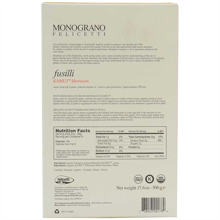 Felicetti does it again with another delicious addition to their Monograno pasta line. This Fussili is handmade from specialty Khorasan Kamut wheat sourced from Tuscany. Their specialty pasta is dense, absorbing sauces and flavors beautifully and offers a distinctly al dente “bite.” Nutritionally rich, this ancient grain is high in protein and includes the wheat germ, adding flavor and extra fiber. Enjoy authentic Italian pasta grown, milled, and specially created in Italy when you order this organic Kamut Khorasan Wheat Fusilli Pasta from Felicetti!