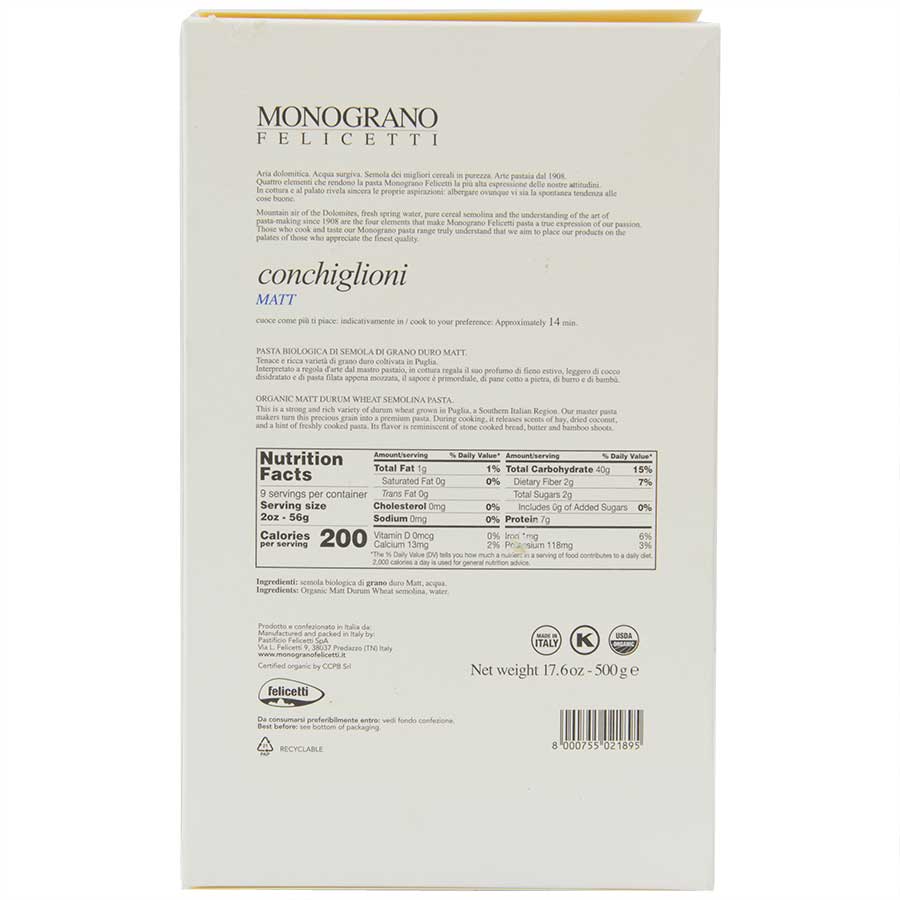 Felicetti is known for its rich and flavorful Italian pasta. Using only the finest ingredients, their attention to detail and mastery of craft is second to none. These conchiglioni are made from matt, a strong variety of durum wheat. A hearty and rich grain, matt boasts a complex and delightful flavor profile. Described as tasting like freshly baked bread with the aroma of dried coconut. This special single-varietal of hard wheat is named “Matt” after the son of the American geneticist who discovered it.