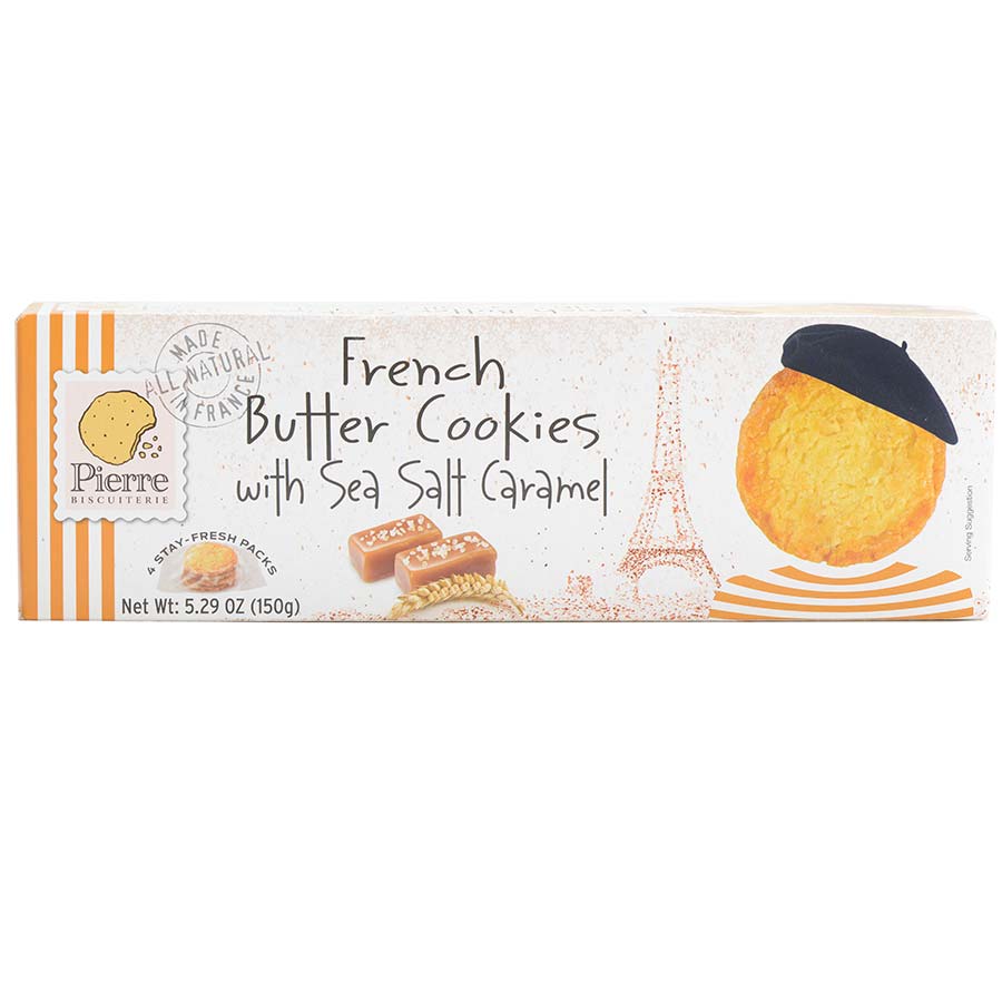 French Butter Salted Caramel Cookies are top-of-the-line cookies from Normandy, France, artisan-crafted from all-natural, GMO-free ingredients. It’s the butter and fresh cream that lends these cookies such an irresistibly buttery texture, crumbling and then melting in your mouth. Creamy caramel and a touch of sea salt adds a delightful flavor combo of sweet and salty.