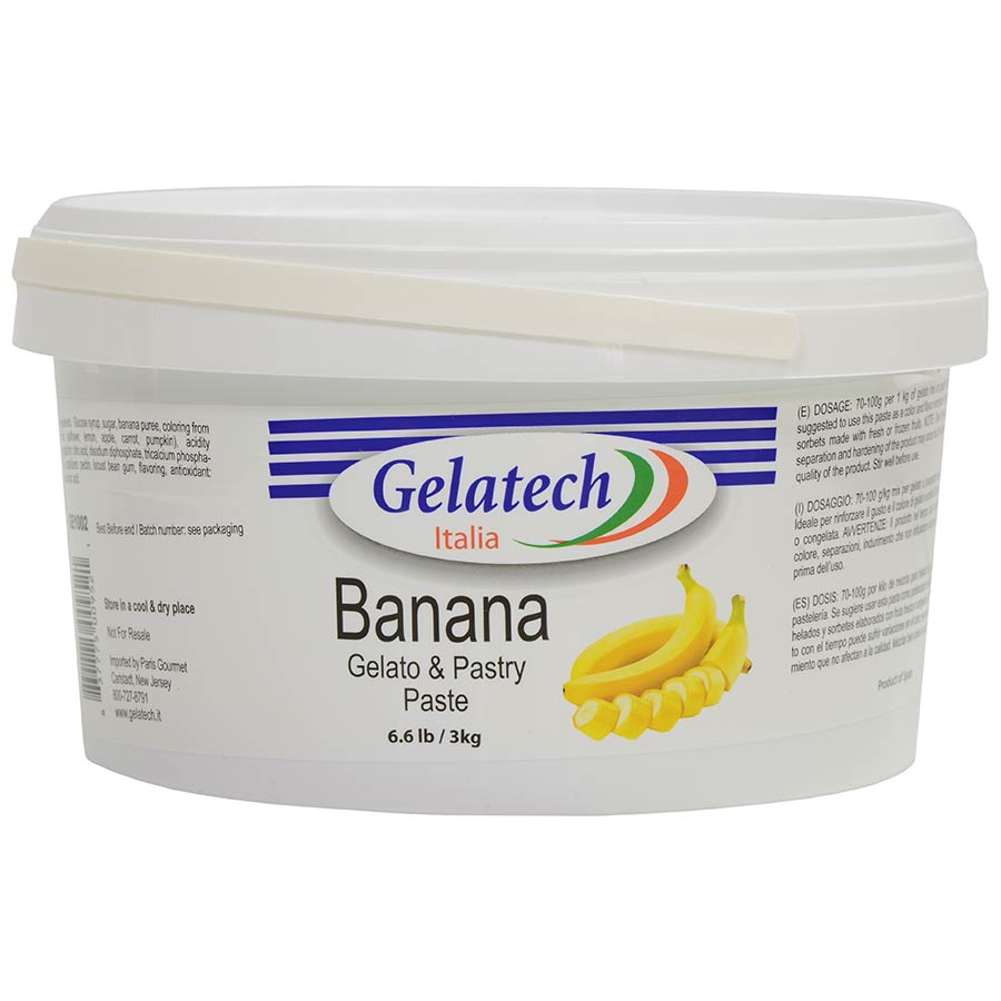 Banana Gelato and Pastry PasteIngredients: Glucose syrup, sugar, banana puree, coloring from food (safflower, lemon, apple, carrot, pumpkin), acidity regulators: citric acid, disodium diphoshpate, tricalcium phosphate, stablizers: pectin, locust bean gum, flavoring, antioxidant: ascrobic acid.Availability: Usually ships within 1 business days. Product is non-perishable and can ship via Ground service.