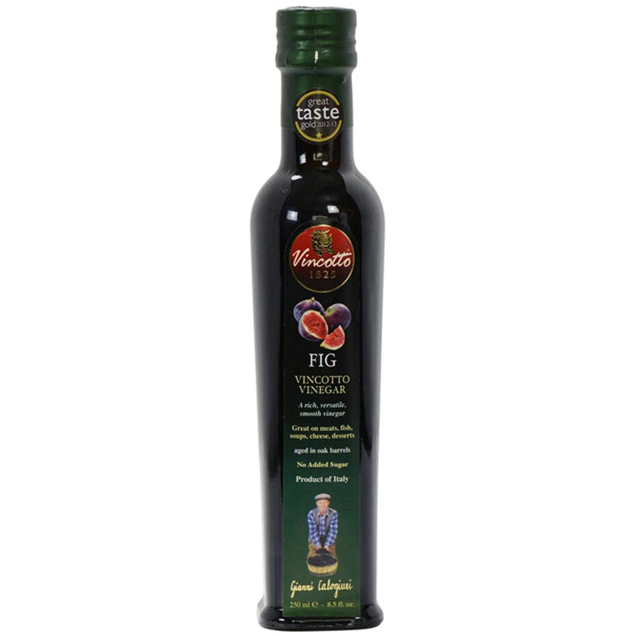 Fig Vincotto VinegarIngredients: Cooked grape must, vinegar, figs. All Natural, no coloring, preservatives or sugar added. Acidity 5%Availability: Usually ships within 1 business days. Product is non-perishable and can ship via Ground service. Origin: ItalianTypes of Vinegar: Fruit Based Vinegar