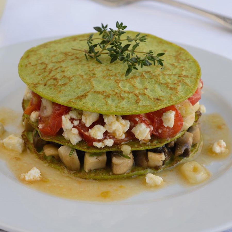 Goat Cheese On Green Pea Blinis RecipeIngredients 1 ¼ cups frozen green peas1 medium egg1 medium egg yolk½ cup milk4 tbsp. all-purpose flour4 tbsp. butter, melted + 1 tbsp. to coat pancake makerSalt and pepper, to taste½ lb. cherry tomatoes, sliced thinly2 garlic cloves, sliced thinly2 tbsp. olive oil3 tbsp. honey7 oz. firm goat cheese, cubed5.3 oz. button mushroomsJuice of ½ lemon2 tbsp. chopped chivesDirectionsIn a large saucepan, cover the pea with water and 1 tsp salt and boil until al dente. Immediately rinse under cold water so color won't bleed out.Place the peas, egg and eggs yolk, milk, flour and melted butter, and process in a food processor until you get a smooth and consistent "batter". Cover and take to the fridge for 20 minutes to cool.Melt 1 tbsp. butter on a griddle and pour ¼ cup of batter. Cook until golden, flip, and cook the other side. Remove and reserve. Make 12.Heat oven to 375 °F.Place the cherry tomatoes and garlic on a roasting pan and drizzle with 1 tbsp. each of olive oil and honey. Bake 15 to 20 minutes and reserve.Sauté diced mushrooms in a large pan with 1 tablespoon of olive oil. Toss with salt, pepper, lemon juice and chiveAssemble your tower: place four blini on a non-stick baking sheet at least 1 inch apart . Cover with mushrooms, top with a second blini, add the roasted tomatoes and goat cheese mix, finish with a third blini.Bake 5-8 minutes, until goat cheese is warmed, garnish with sage and serve.This recipe is found in:Recipes by Course or Meal: Appetizers and Side Dishes, Main CoursesRecipes by Season: Spring and Summer Recipes