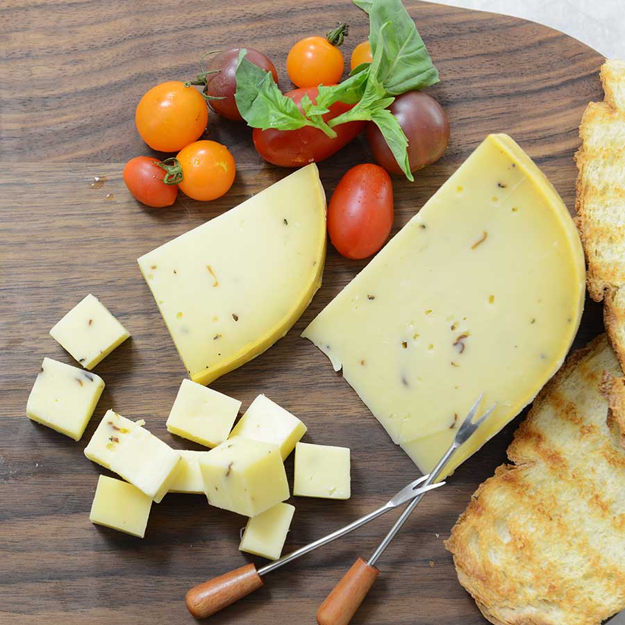 With the ideal balance of sweet and earthy tastes, there is no end of delicious options for this gourmet cheese. Available in a host of sizes: purchase Lindenhoff’s decadent gouda with truffles in half-pound, whole-pound, or 18-pound wheels!