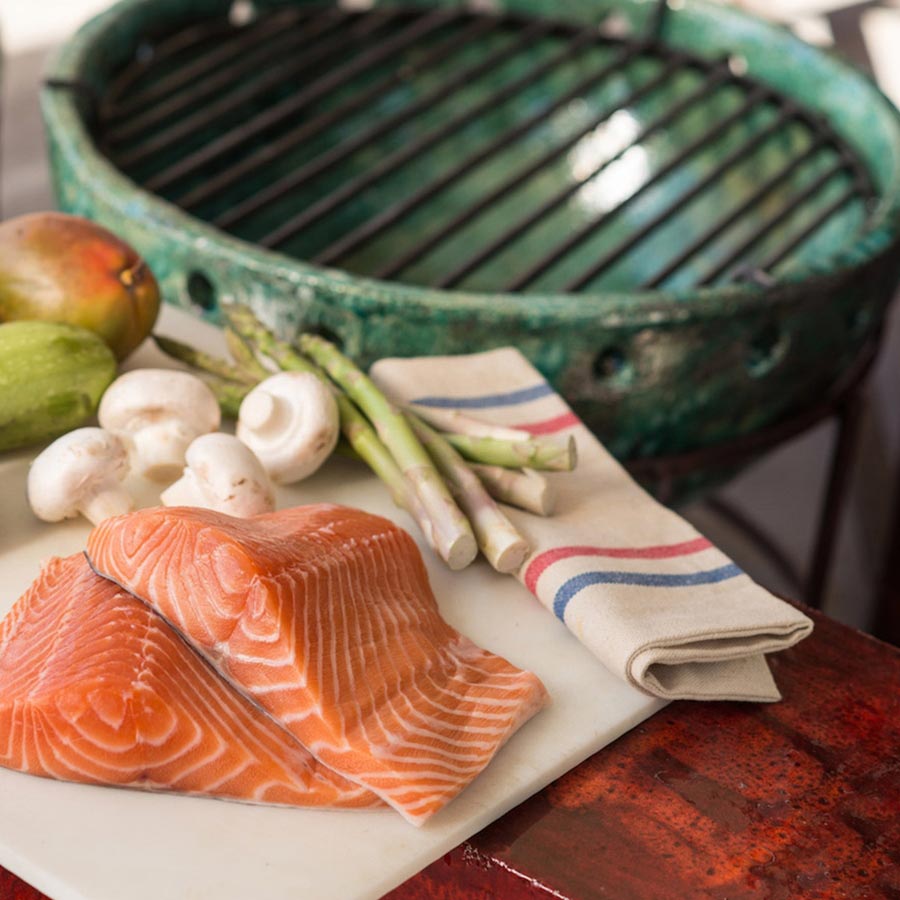 Grilled Salmon Kebabs RecipeIngredients 3 skinless salmon filets (about 1 lb. each), cut into 1.5-inch cubes8 oz. button mushrooms2 zucchinis, cubedJuice of 1 large lemon5 tbsps. olive oilKosher salt (for the salmon)2 medium tomatoes, unseeded, cubed2 small red onions, chopped1 medium mango, cut into small cubes2 tbsps. champagne vinegarSalt and freshly ground pepper, to tasteDirectionsBrush your grill with oil and make sure your coals are evenly spread.Cut the veggies into cubes, trying to get the sizes as similar to the salmon as possible.Starting with a piece of salmon, thread salmon, zucchini and mushrooms, until the skewers are filled. Brush with olive oil, season with salt and pepper and grill, turning, 3-5 minutes on each side. Spray with lemon juice when done.For the salsa, toss the tomatoes, onions, mango, 3 tbsp. olive oil, vinegar and salt and pepper. Refrigerate until use. Serve salsa on top of skewers.This recipe is found in:Recipes by Ingredient: Seafood RecipesRecipes by Course or Meal: Main CoursesRecipes by Occasion: Grilling, Labor Day and 4th of July RecipesRecipes by Cuisine: American Recipes Recipes by Season: Spring and Summer Recipes