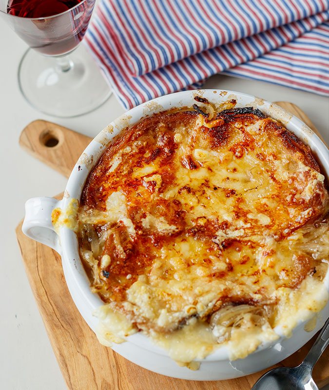 French Onion Soup is a classic starter for any cool or cold weather meal. Our recipe is succulent and full of bubbling melted cheese and caramelized onions. The beef stock makes it robust, and the baguette slices perfectly balance the flavors. Our version doesn’t part from the original classic French soup, so don’t worry about upsetting the purist at your table. It’s a great way to kick off a dinner gathering.