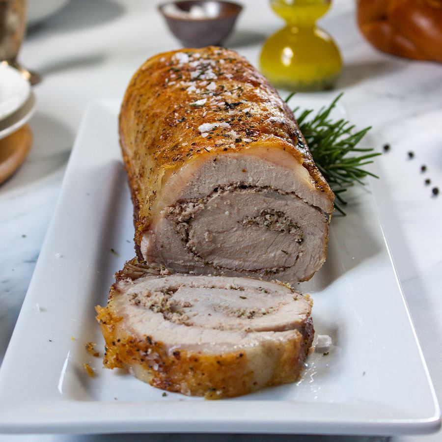 Skinless and boneless pork loin makes the ideal foundation for a good sauce and in our case, a good filling as well. The Tuscan-inspired flavors of this center-cut pork loin roast are the perfect complement to rich Iberico pork. Stuffed with pancetta and drizzled with a bright rosemary-infused sauce, here’s a recipe you’ll be thinking about long after the leftovers have disappeared.