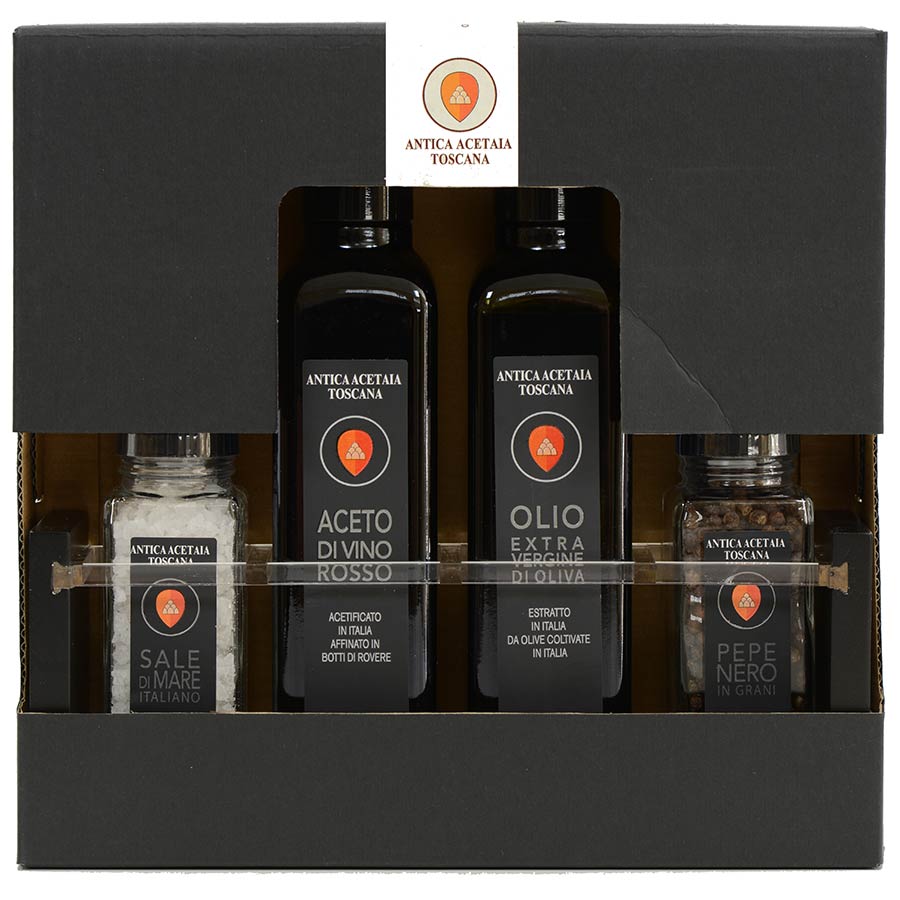 Take your seasoning to the next level with this gift set of 4 essential Italian condiments by Il Boschetto. The set includes a bottle of fine Italian Extra Virgin Olive Oil, a bottle of Red Wine Vinegar, and two grinders, one filled with premium sea salt and one loaded with zesty whole black peppercorns, all in a beautiful and elegant container made of glass and wood, perfect to display at the table.