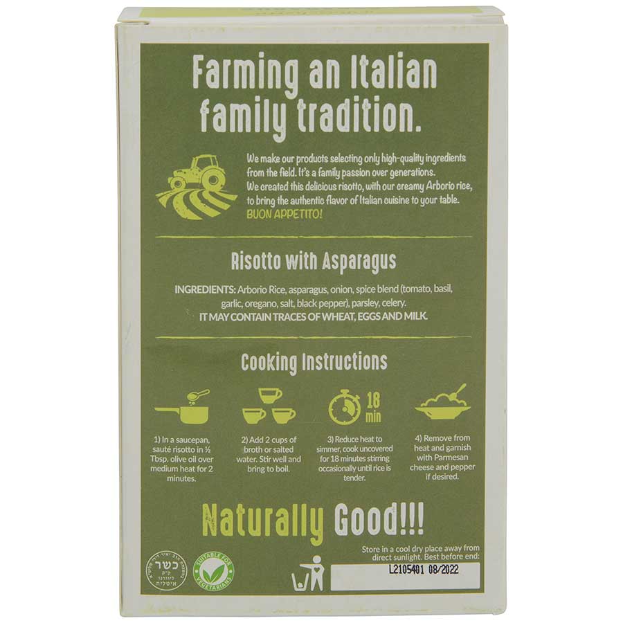 Ingredients: Arborio rice, asparagus, onion, spice blend (tomato, basil, garlic, oregano, salt, black pepper), parsley, celery.
