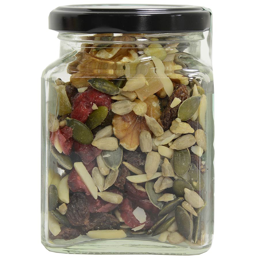 Ingredients: Sunflower seeds, pistachio, walnuts, pitted raisins, dried pineapple, red berries, etc.