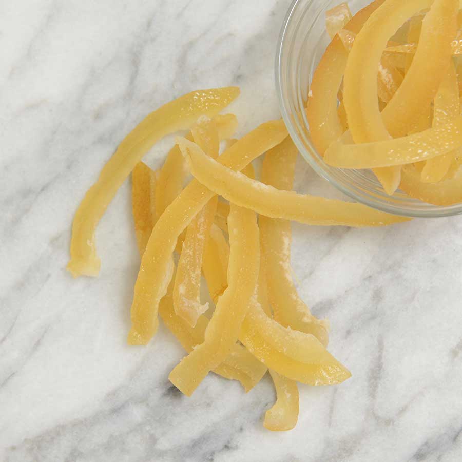 Beginning with the careful selection of premium lemons. The peels are removed, sliced thin, blanched and then expertly candied to create a tantalizing treat that bursts with citrusy flavor.