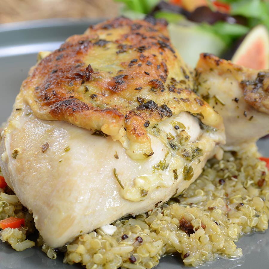 Jidori Chicken comes with the wing joint still attached. By leaving the bone in, the fattier sections of the bird cook evenly. There’s no end to what you can do with a Jidori Chicken. Roasting allows the buttery chicken taste to come through with a firm, not chewy, mouthfeel. Cover the bone in foil so it won’t burn.