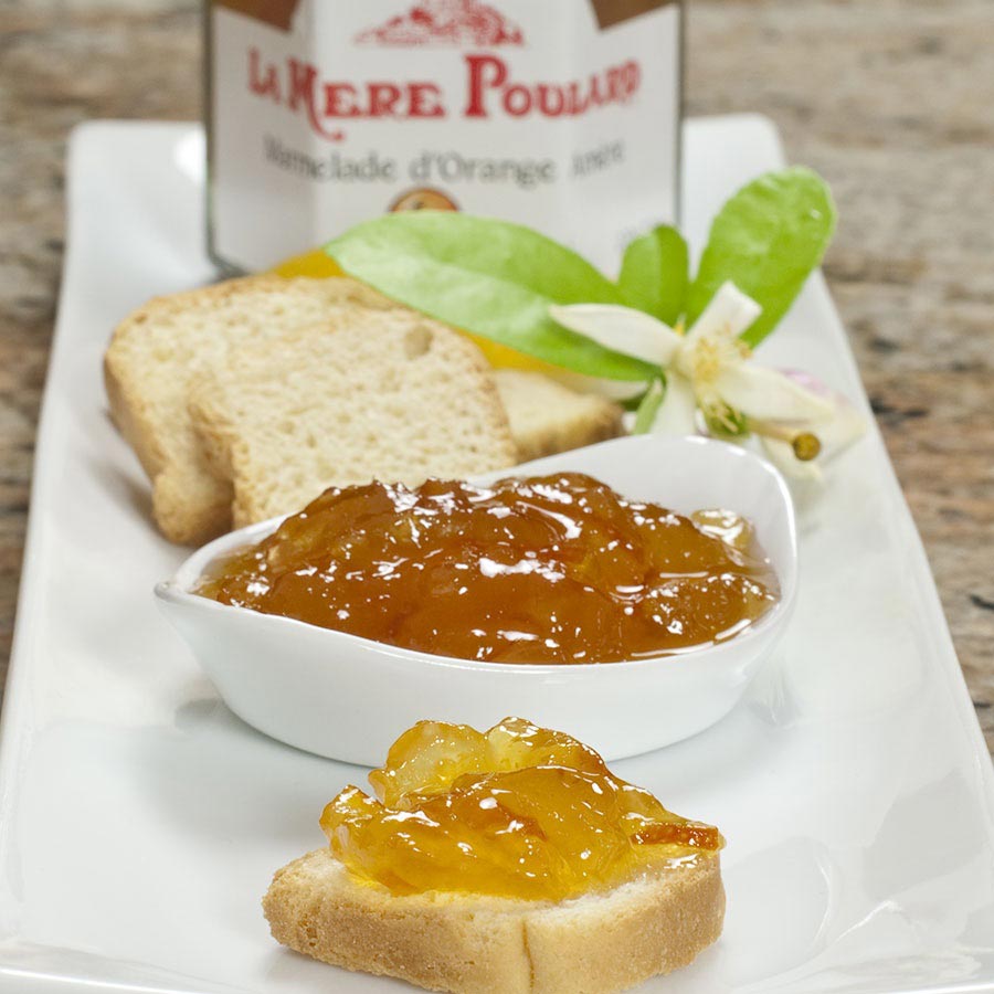 Bitter Orange MarmeladeA blend of 50% Bitter Oranges blended with natural cane sugar, this is sweet but with a wonderful natural tartness, La Mere Poulard’s Bitter Orange Marmelade is just the thing that was missing to wake up your morning breakfast routine. Smooth over some freshly baked scones in the afternoon. It’s crafted by one of France’s most renowned culinary brands: La Mere Poulard, a French chef famous for her restaurant and Inn in Mont-Saint-Michel. Her preserves and out-of-this-world cookies, using natural ingredients, are just gorgeous.Ingredients: oranges (50%), cane sugar, lemon juice, gelling agent: fruit pectinStorage: room temperature, refrigerate after openingAvailability: Usually ships within 1 business days. Product is non-perishable and can ship via Ground service.
