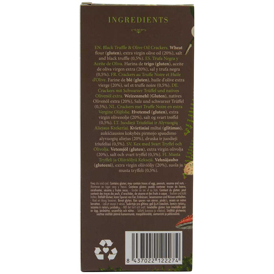 Black truffle adds an earthy, umami-rich depth that is both indulgent and decadent, while olive oil imparts a subtle fruity richness. Finely milled flour creates a light, crisp cracker that serves as the perfect base for these opulent flavors.