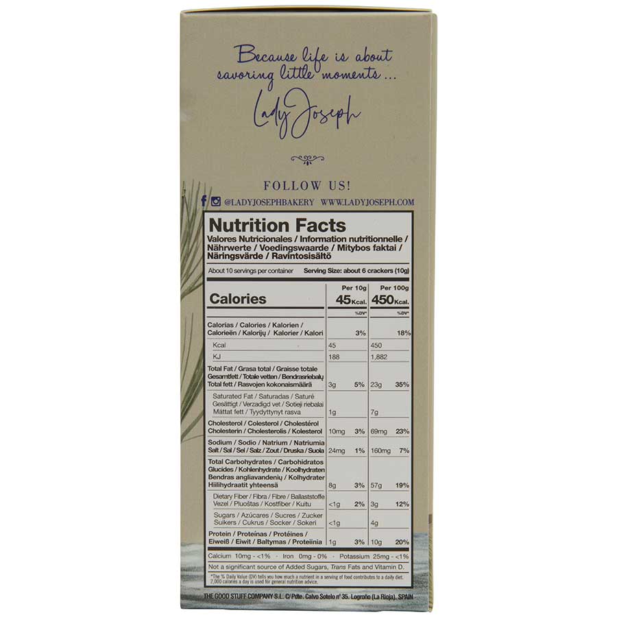 These artisan crackers are a celebration of taste. With every bite, you'll experience the perfect blend of sea salt and olive oil, reminiscent of the coastal beauty and the rich flavors of the Mediterranean. More than just a snack, these crackers are a culinary masterpiece, a symbol of Lady Joseph's legacy in redefining vegan gourmet cuisine, and a delicious treat that brings the magic of the Mediterranean to your meals.