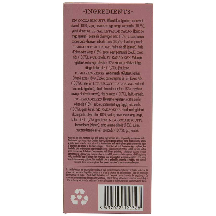 Ingredients: Wheat flour, extra virgin olive oil (18%), sugar, pasteurized egg, cocoa nibs (10.7%), yeast, cinnamon.