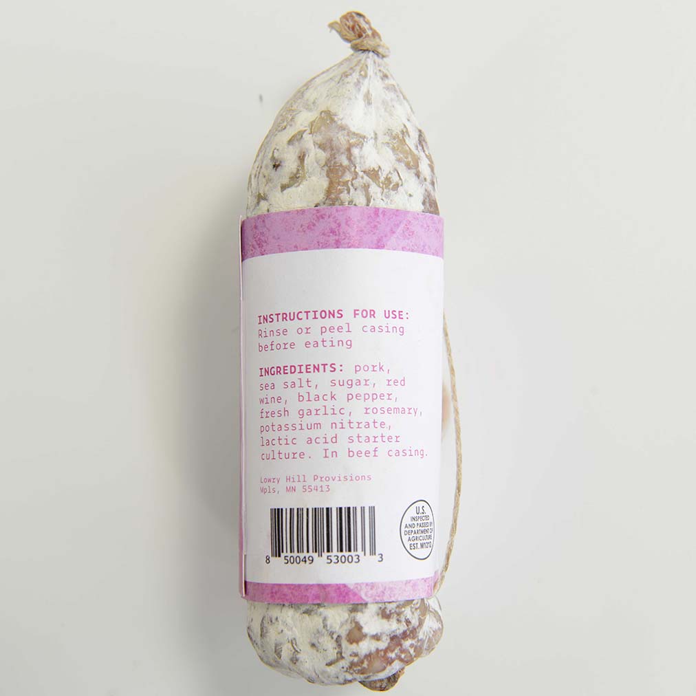 Ingredients: Pork, sea salt, sugar, red wine, black pepper, fresh garlic, rosemary, potassium nitrate, lactic acid started culture. Beef casing.