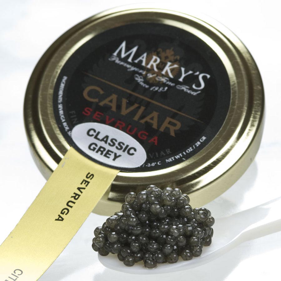 Sevruga Classic Grey Caviar - Malossol, Farm RaisedClassic Sevruga caviar is the choice of those who want the best. Harvested from the Sevruga sturgeon "Acipenser stellatus" in the Caspian and Black Seas, this true caviar: grey, aromatic and pearlescent, with a crisp finish. Perfect for a luxurious amuse-buche, or to pair with a selection of caviars in a sampler. Sevruga Classic Grey caviar sturgeon scientific name: Acipenser StellatusIngredients: Sevruga roe, salt.Storage: 29 - 32 FAvailability: Usually ships within 1 business days. Product is perishable and must ship via Overnight service. Type: Sevruga , Sturgeon CaviarPackaging: Individual CaviarsBrand: MarkysColor: GreyOrigin: American , RussianCaviar Source: Farm Raised