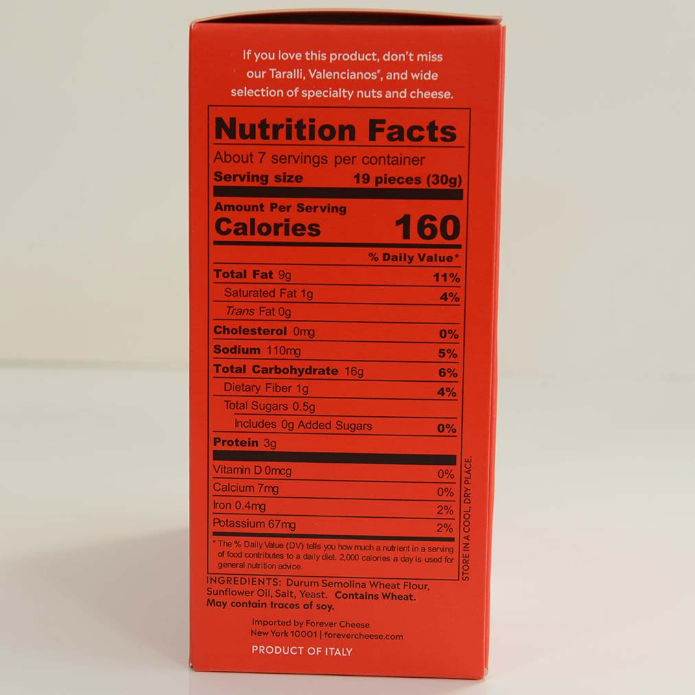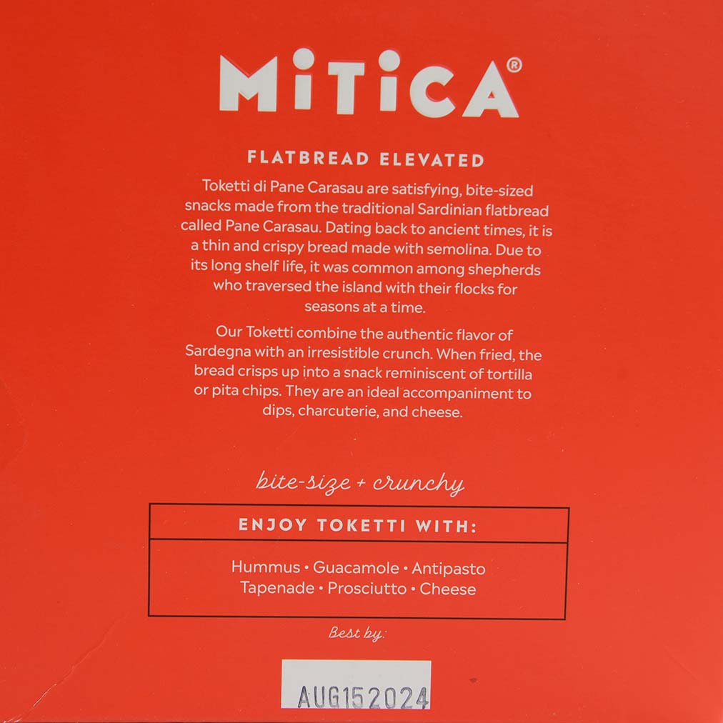 Toketti di Pane Carasau - Sardinian Flatbread ChipsIngredients: Durum semolina wheat flour, sunflower oil, salt, yeast. May contain traces of soy.Availability: Usually ships within 1 business days. Product is non-perishable and can ship via Ground service. Pantry Categories: Crackers and BreadOrigin: Italy