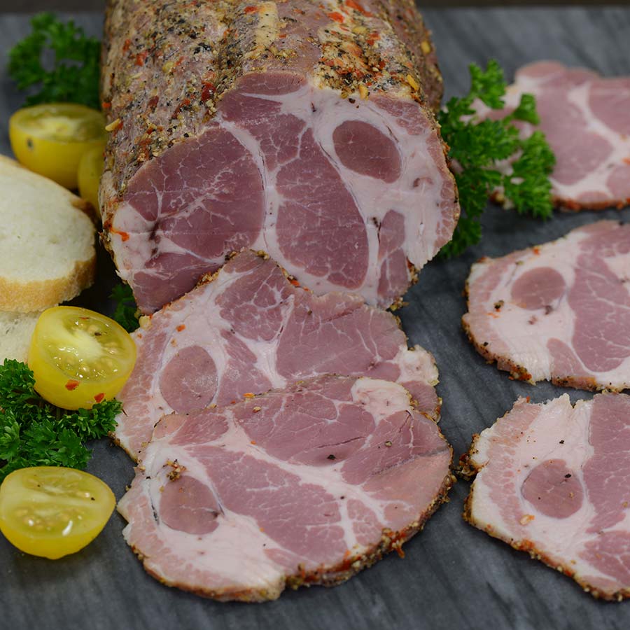 The result? A delicately balanced flavor that’s 30% fat and 70% lean, giving every bite a perfect harmony of rich, fatty undertones and tender, spiced meat. Its bold yet refined flavor shines whether enjoyed as part of an antipasto platter with Burrata and Dijon mustard or thinly sliced in a classic Italian sandwich. Feeling fancy? Top your pizza with Capicola, fresh mozzarella, and a drizzle of olive oil for a truly elevated slice.