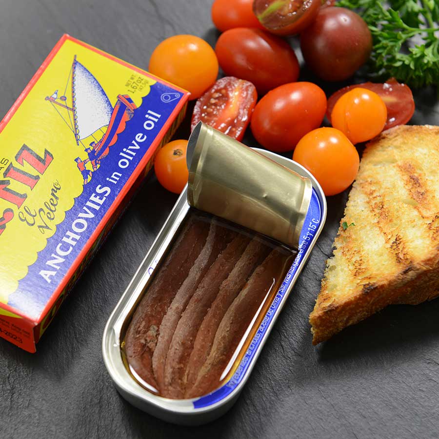 Spanish Anchovies in Olive Oil Ingredients: Anchovies, olive oil, saltAvailability: Usually ships within 1 business days. Product is non-perishable and can ship via Ground service.