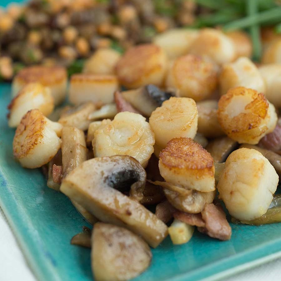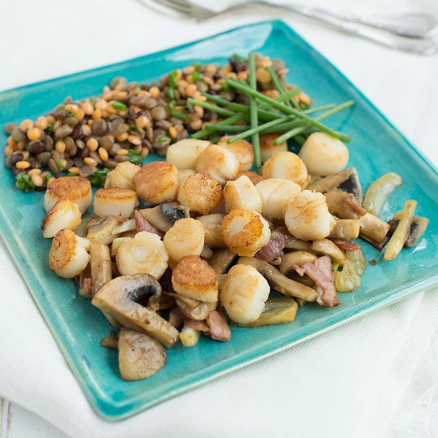 Pan Seared Sea Scallops With Mushroom Saute and Lentil Salad RecipeScallops and Mushroom Saute3 tbsp. extra virgin olive oil3.5 oz. smoked pancetta or bacon, sliced6 oz. white button mushrooms, quartered1 fennel bulb, julienne¼ cup white wine (Chardonnay)1 ½ lbs. dry sea scallops, clean and side muscle removedSalt and fresh ground pepperLentil Salad½ cup red or pink Turkish lentils pre-cooked¼ cup green or Dupuy lentils1/3 cup de chopped chives3 tbsp. extra virgin olive oil1 ½ tbsp. white wine vinegar½ tsp. sea salt¼ tsp. pimientoDirectionsPreheat oven to 320 °FHeat 2 tbsp. olive oil in a large saucepan over medium heat and add the pancetta. Cook until barely browned but not crispy. Add the mushrooms, fennel and wine and turn down the heat. Cook until the fennel is tender, about 3 minutes.Remove from heat and transfer to a medium oven pan. Cook in the oven at 320 for 8 to 10 minutesHeat a heavy skillet or pan over high heat and add 1 tbsp. olive oil. Place the scallops in the pan. Sear for about 1 to 1 ½ minutes until browned and then carefully turned them around and cook the other side for another 1- 1 ½ minutes. The scallops should have turned opaque. Do several batches if necessary, the scallops shouldn’t be touching each other in the pan. Remove from heatSeason with salt and pepper.Mix the lentil salad ingredients together and serve the lentils, mushrooms and scallops on a plate together.This recipe is found in:Recipes by Ingredient: Seafood RecipesRecipes by Course or Meal: Main CoursesRecipes by Season: Spring and Summer Recipes, Fall Recipes