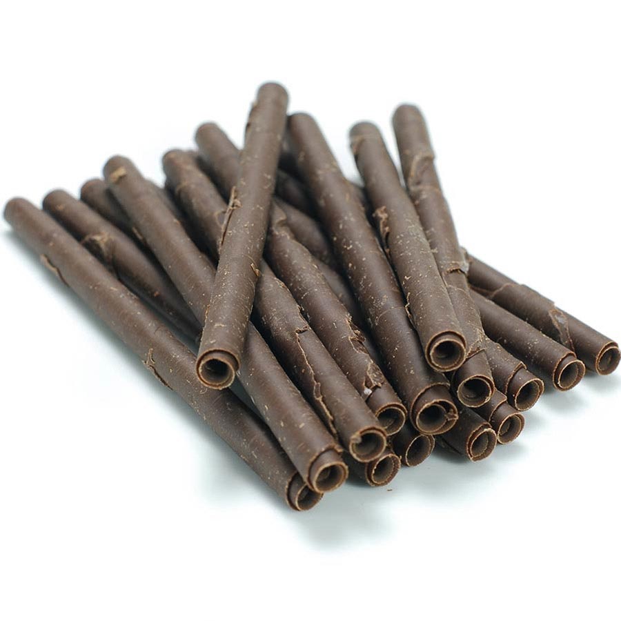 Dark chocolate is a popular favorite, thanks to its bold flavor profile and intensely aromatic quality. Its distinctive flavor will bring a bitter, earthy edge to your creations, balancing sweet desserts and adding nuance and character. Our chocolate cigarettes are evenly rolled for use in cake decoration and garnishes. Used vertically around the sides of cakes they are one of the most effective ways to transform a plain sponge into an impressive celebration cake!
